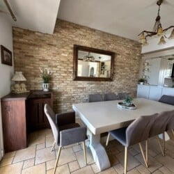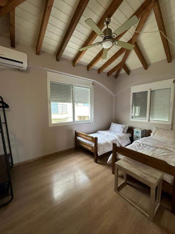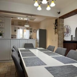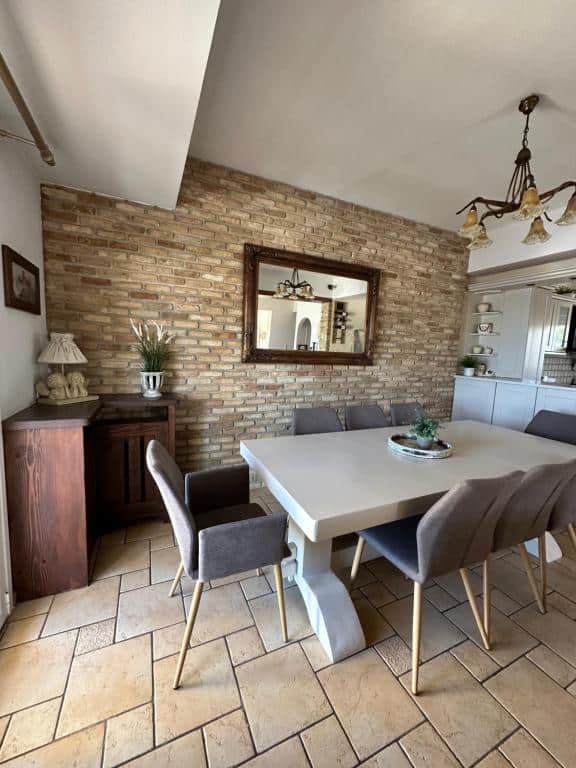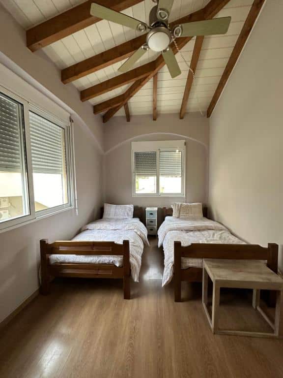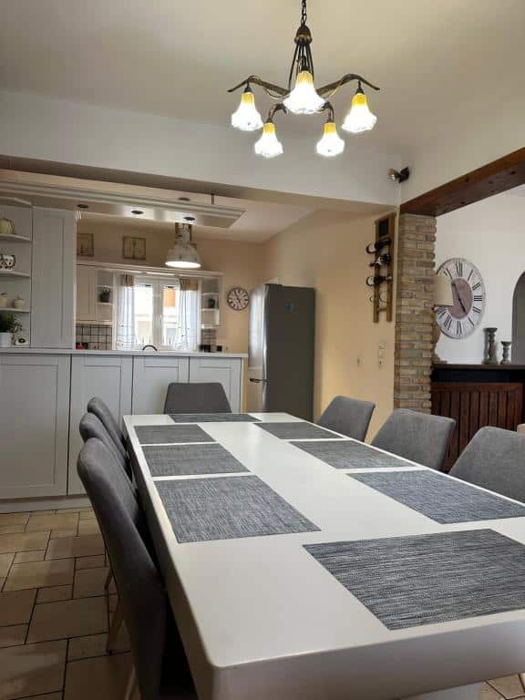 It is a detached two-story house with 4 bedrooms, a fully equipped kitchen, 3 bathrooms, and also features a garden with BBQ.